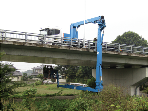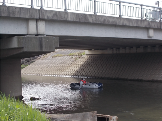 交差物が河川で、水深が深く、なおかつ橋梁点検車が使用できない現場では、ボートを使...